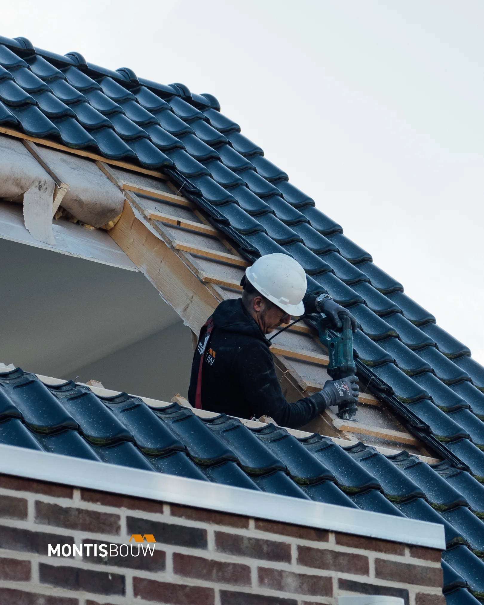 We zagen het gat in het dak, verwijderen de dakpannen en passen de constructie nauwkeurig aan.
